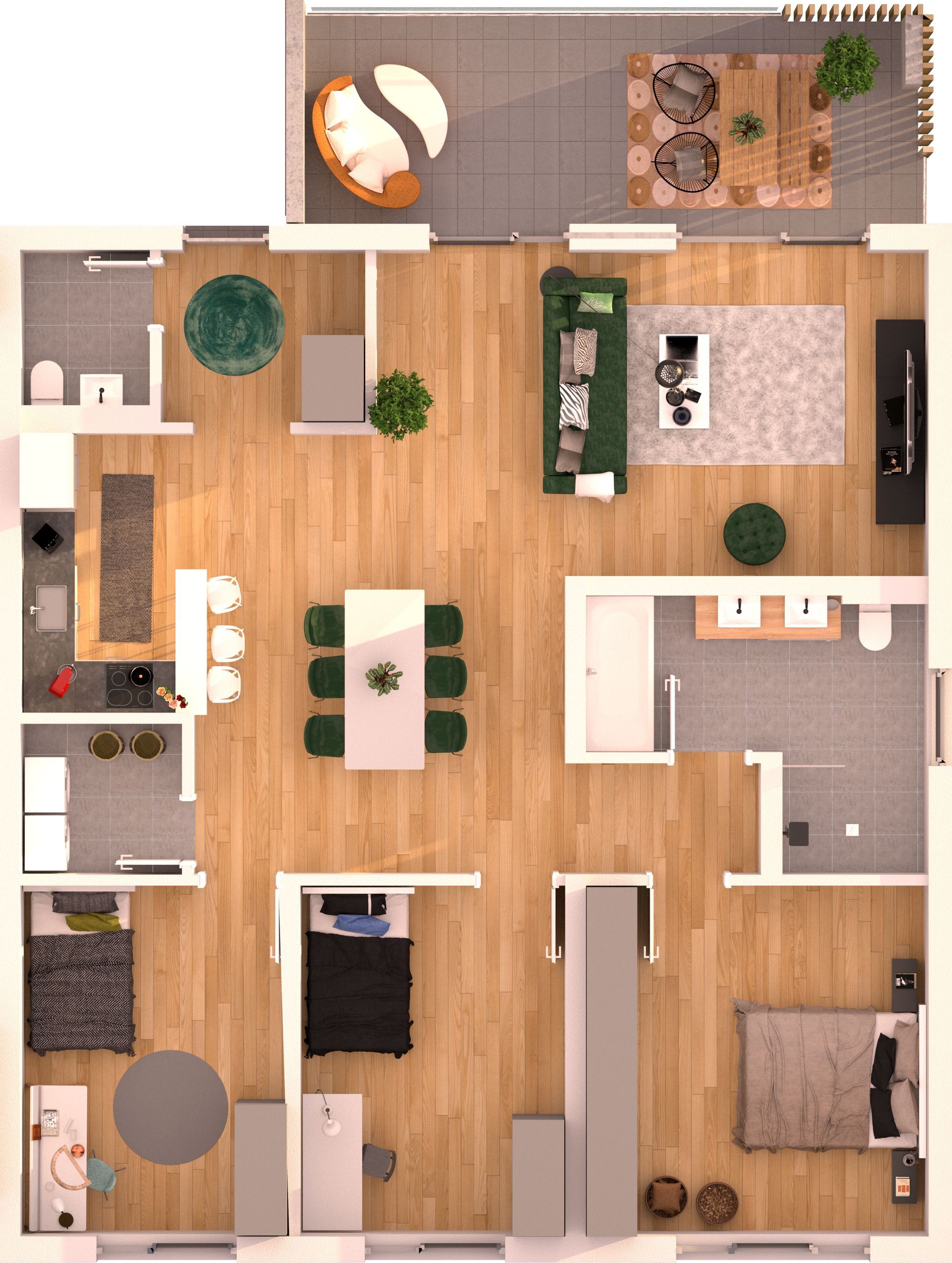 Die 4-Zimmer-Wohnung mit ca. 126 m² überzeugt durch ihren hellen, modernen und hochwertigen Ausbau. Der Koch-Wohn-Essbereich bietet ausreichend Platz für die ganze Familie und Zugang zum Balkon, der sich ideal für entspannte Stunden an schönen Tagen eignet. Die beiden separaten Kinderzimmer sind ideal für die Kleinen, können aber auch als Büro genutzt werden. Das Badezimmer ist mit einer Badewanne und einer bodengleichen Dusche ausgestattet, und zusätzlich steht ein separates WC zur Verfügung.